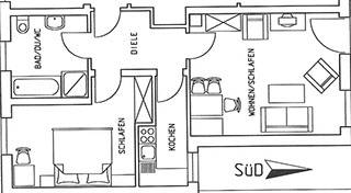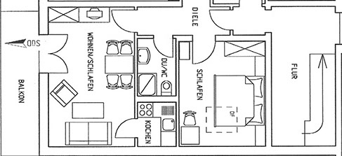 ist 42 m², liegt im 2. Stock und ist für 1-2 Personen geeignet. Schlafzimmer mit Doppelbett und Bettwäsche. Wohnküche mit Sat-TV und komplett ausgestatteter Küche. DU/WC mit Handtüchern, Balkon.