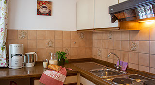 ist 42 m², liegt im 2. Stock und ist für 1-2 Personen geeignet. Schlafzimmer mit Doppelbett und Bettwäsche. Wohnküche mit Sat-TV und komplett ausgestatteter Küche. DU/WC mit Handtüchern, Balkon.